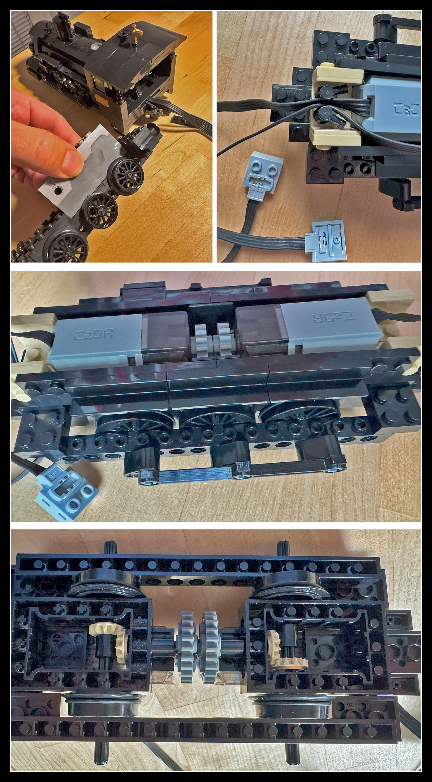 Der Kessel der Lok ist so niedrig, dass die Konstruktion hauptsächlich von den Technic-Bricks außerhalb der Räder getragen wird. Angetrieben von zwei Cada M-Motoren, die Kabel werden unter dem Führerstand zum Hub im Tender geführt.