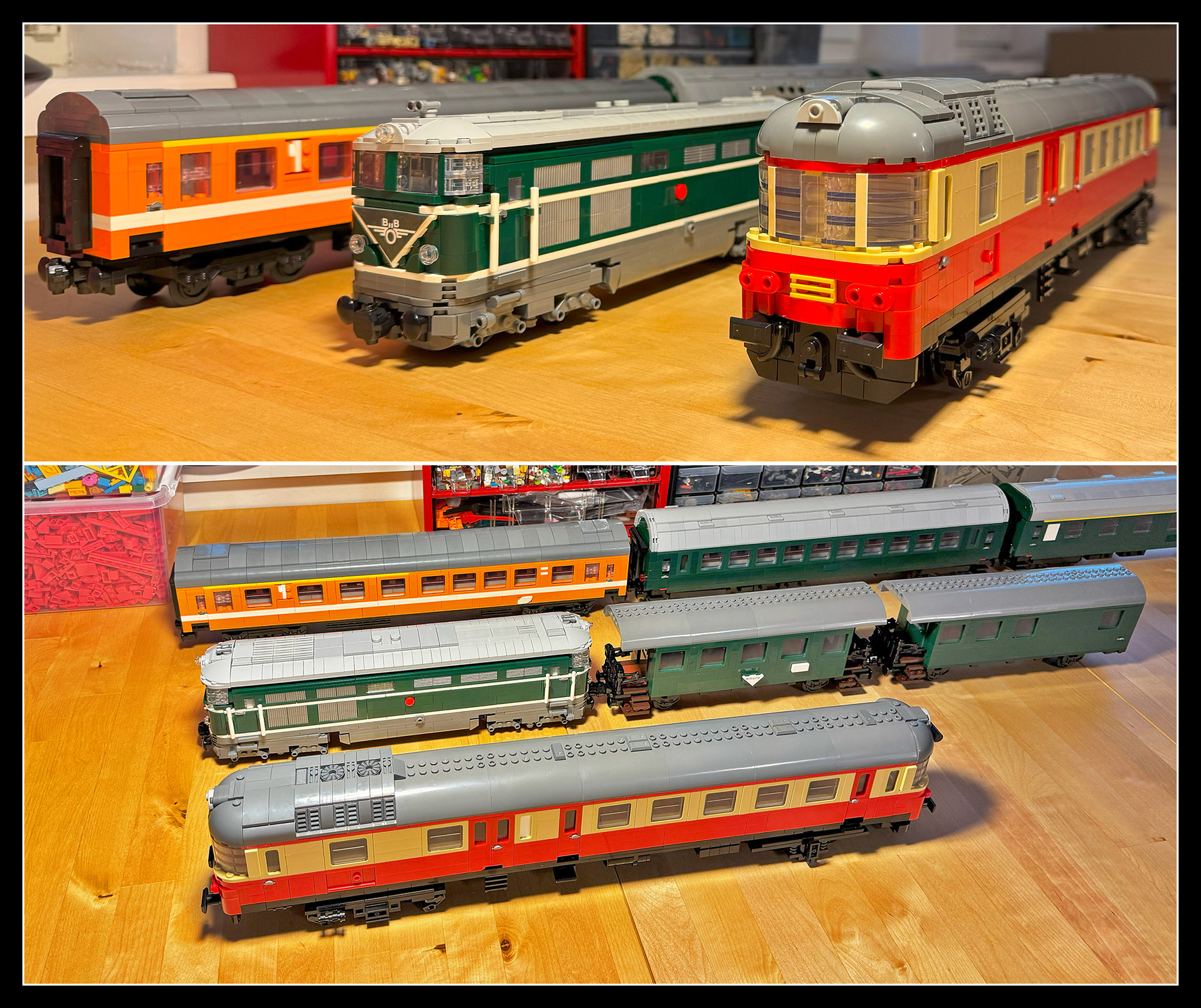 Das Vindobona / FJB Addon-Package zum "Blauen Blitz" mit ČSD-Baureihe M 296.1 Triebwagen, ÖBB 2050 Henschel-GM Diesellok, orangem ÖBB UIC-X AB und zweiachsigen Spantenwagen, sowie zwei ČSD Görlitzer UIC-Y-Wagen. Außerdem habe ich mich zum Bluebrixx DR VT 18.16 doch noch im September-Abverkauf hinreißen lassen, für eine fast komplette "Vindobona"-Kollektion - da er EOL geht, für vier Wagen 75€. Mehrteilige Triebwagen selbst konstruieren ist keine Passionssache, bei all den wiederholenden Bauten. Da bin ich froh über eine schnelle Komplettlösung, die halbwegs gut aussieht.